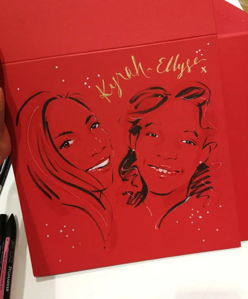 I was invited by Kiehl’s to join them again for more live illustration fun at three of their stores during the lead up to Christmas (Harrods, Selfridges and Regent Street). The idea was to expand on gift box personalisation I had done in September but this time on red boxes and using glitter for the lettering. As glitter can be quite messy and glue takes a while to dry I came to the conclusion of pre-glittering boxes for the events with the messages ‘Happy Holidays’, ‘Just for You’ and ‘With Love’, then in store I added names and personalised messages in gold as well as offering portraits on the back of the gift boxes!